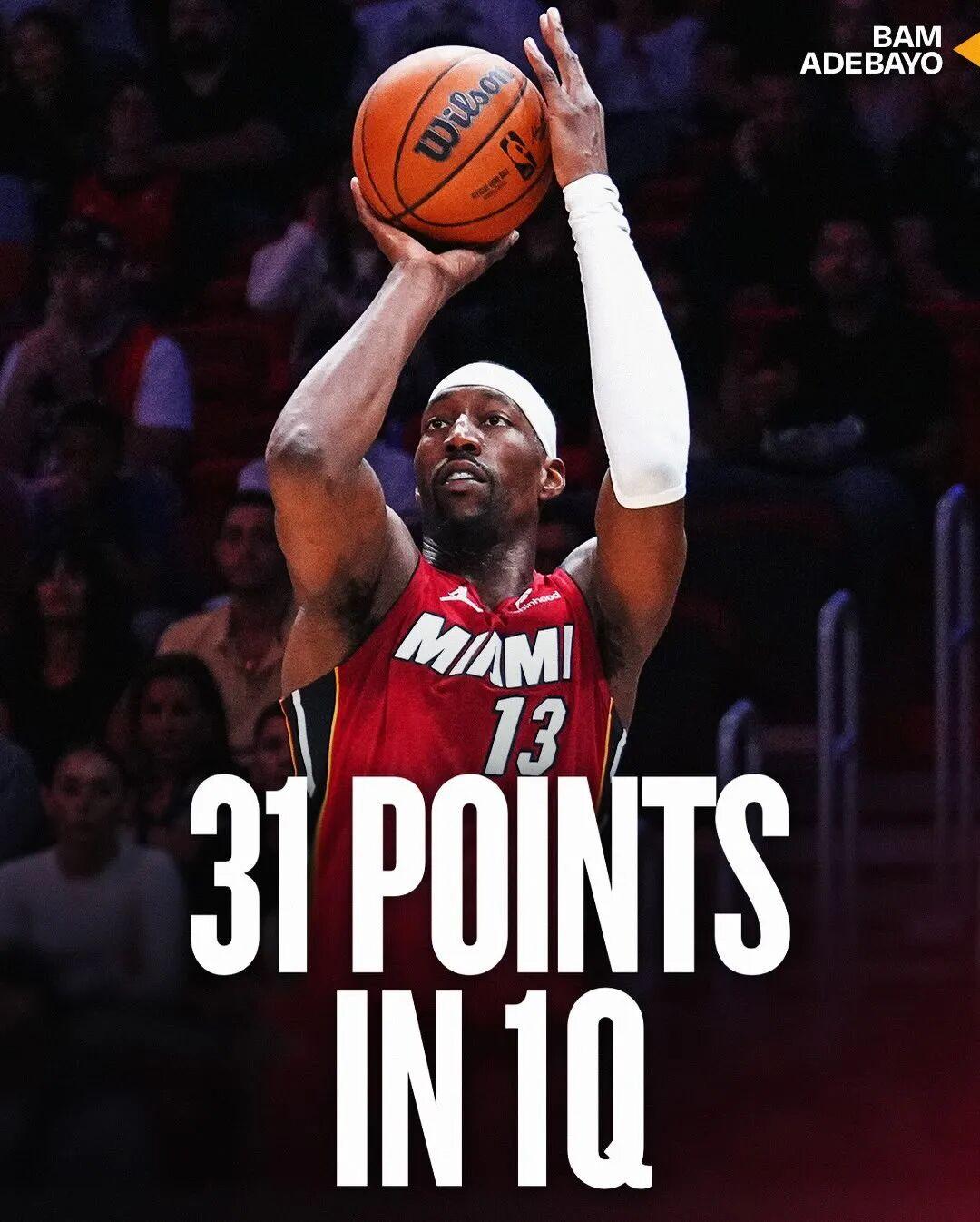 第一节比赛,阿德巴约就火力全开,单节打满12分钟,投篮16中10,三分8中5,罚球7中6,拿下31分3篮板1抢断1盖帽。